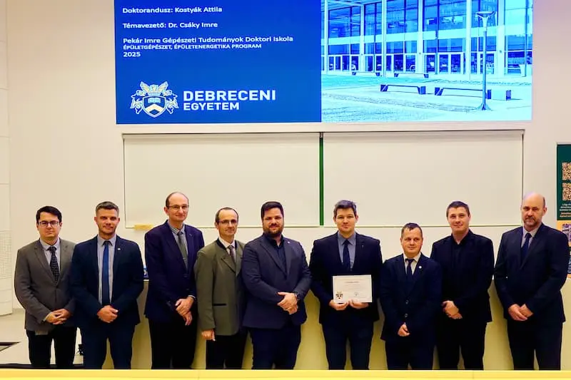 On December 4, the Faculty of Engineering of the University of Debrecen hosted the first public doctoral defense in the history of the Pekár Imre Doctoral School of Mechanical Engineering. The candidate presented his dissertation, “Reducing the Cooling Energy Demand of Air Handling Systems with an Indirect Evaporative Air Cooler,” before the Committee and an expert audience. The scientific depth and polished delivery of his lecture both reflected a high academic standard, providing a fitting and exemplary start to the School’s series of doctoral defenses.